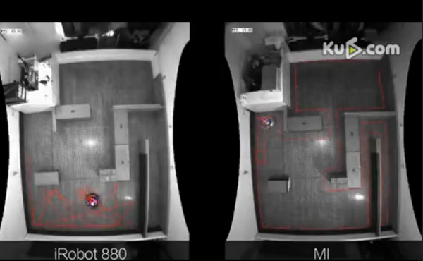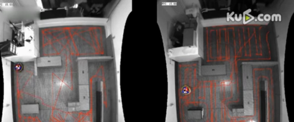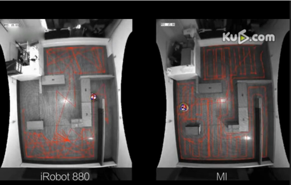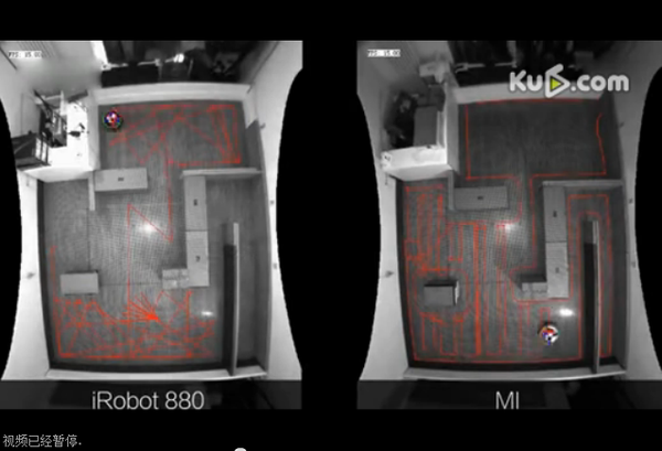 过了很长时间,大概就是右边小米扫荡时间的一倍左右,左边的扫地机好像卡在上面区域了,一直在这里游荡,地面上的红线就是扫地机的行进路线,一直到视频结束,左边的还在上面游荡。
