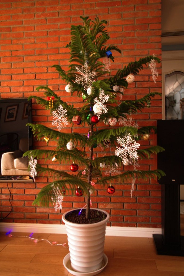最后,圣诞节快到了,发张用家养南洋杉装扮成圣诞树的照片,