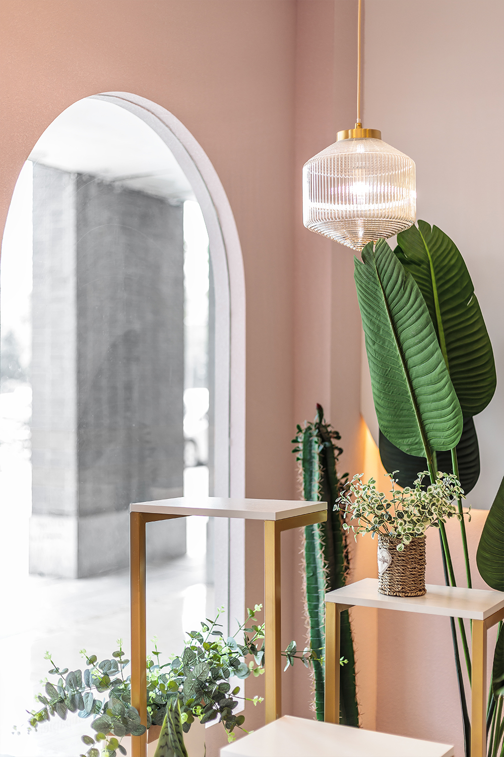 门头和室内空间以千禧粉作为主色调,通过艺术构建的渲染,将空间的美好与世界连接。金色的吊灯,灰色的接待台都相辅相成。