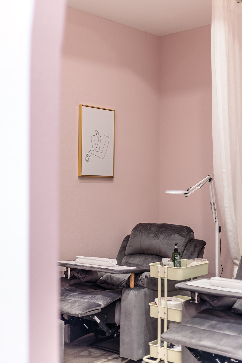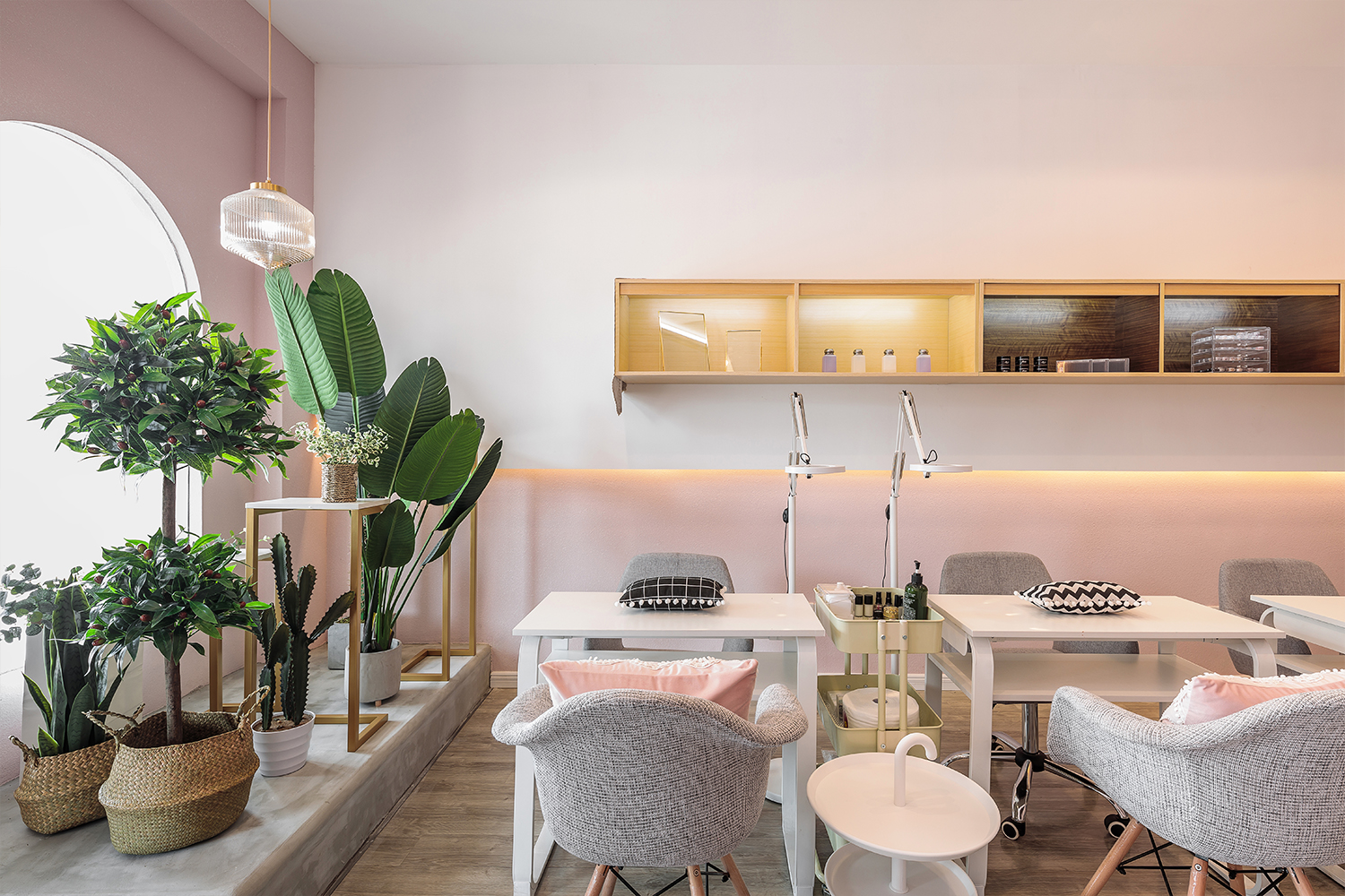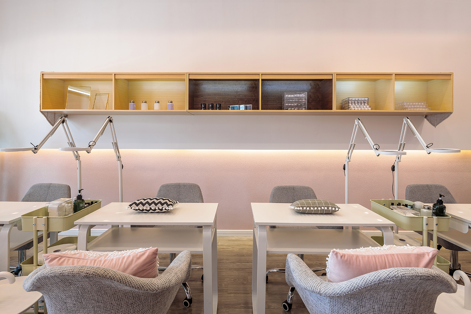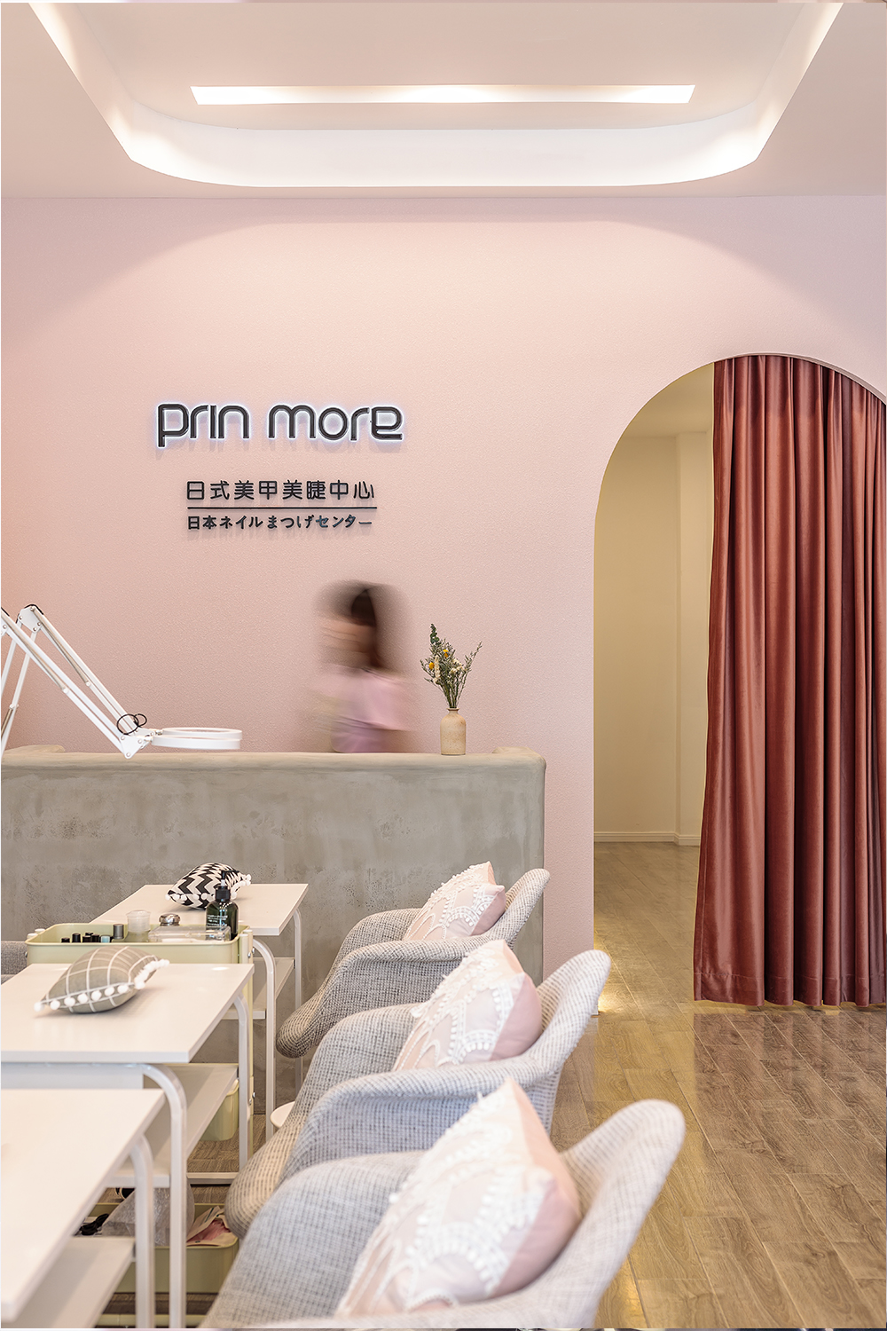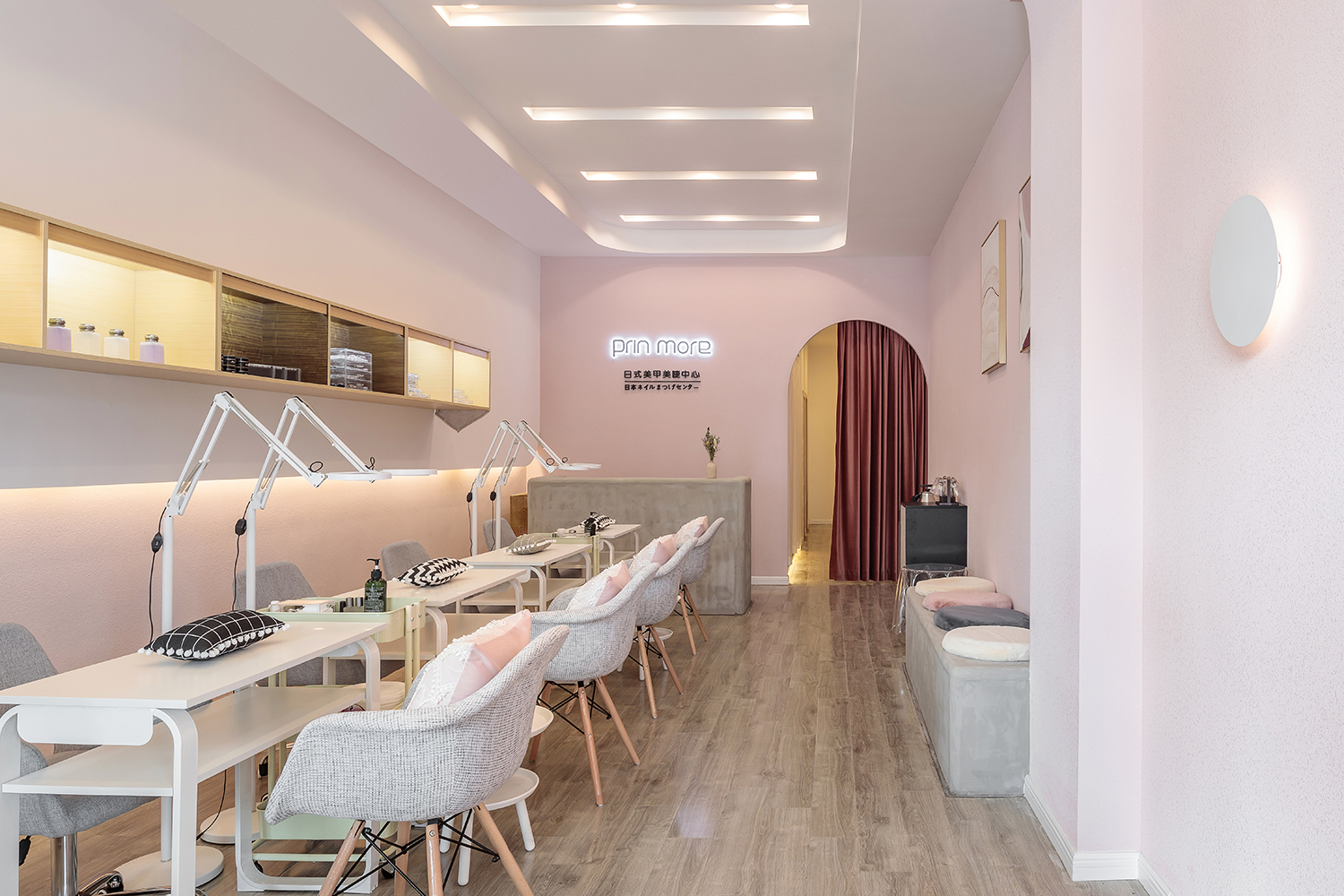 设计师XIN:此次项目是一个日式美甲美睫中心,我们将千禧粉融入到整个设计中,作为本案的主要色彩美学。 淡粉色是一种较难驾驭的颜色,尤其在搭配上格外娇气,一旦失当就会破坏整体氛围。因此,我们使用了较为坚硬的水泥灰的卡座、前台。浅灰色的木地板,原木色的展示柜等元素来抵消这一点。共同打造出一个柔软而又强大的女性空间。
