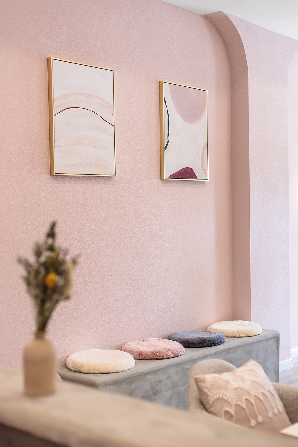 保留原有顶面并进行圆角的处理、拱形门洞、现场新砌的水泥卡座和地台、整齐专业的设备与千禧粉的搭配,表达出一种理性的温柔或力量。