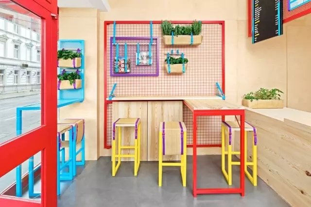kesSalao 是一家主营地中海风味的小餐厅,由西班牙工作室 Masquespacio Design 设计。 空间颜色鲜艳,搭配在一起十分亮眼;设计师利用翻板桌让小空间拥有大容量,店主可以根据不同的需求随意调整。