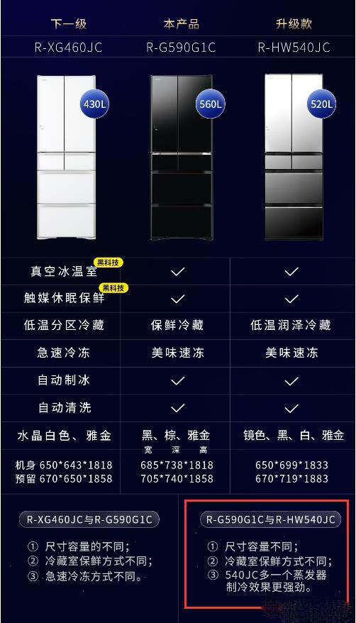 还有一点重要的,很多人会忽略,日立冰箱官宣可以做到三面预留0.5CM空间即可,之前看了其它牌子,至少官方都宣传大部分要10CM,再小也要5CM,这样日立的实际占地面积更小,确实是我最好的选择。日立目前有460、490、540、590这四款我都能放下,特别是R-G590G1C,还多40升容积,价格还便宜点儿,最终为什么选择了540,道理很简单,540用了双循环制冷,而且带低温润泽冷藏,这个是官方对两款机型的对比。