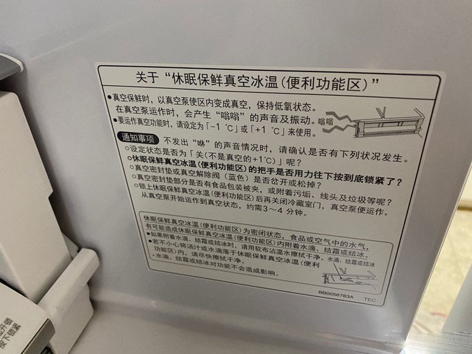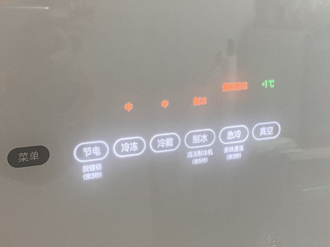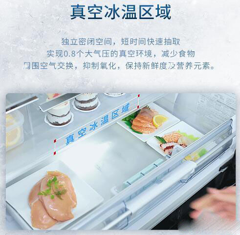 真空保鲜室,就是大家经常说的:打开听到那“哧”的泄气声带来的愉悦。这个单独区域可以根据放入的东西,自行在-1~1度调节温度。简单的理解就是抽真空保鲜。当时销售介绍可以保持三文鱼3天的新鲜无任何色、味、湿的改变,反正就是很新鲜的感觉,没试,不知道是否如此。这一格最常见的应用场景应该是买回来三~五天内吃完的肉类,可以放入,避免冷冻、解冻步骤。