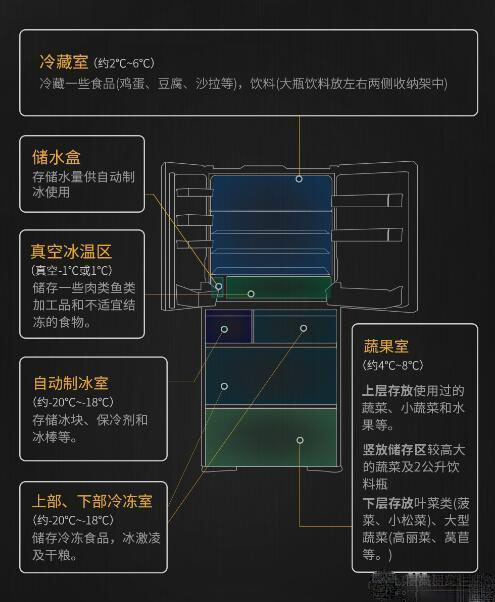 第一大部分为冷藏室打开是这样的一共五层,上面四层和其它冰箱一样,可以按需组合,最下面左边是制冰水箱,右边是真空保鲜室。