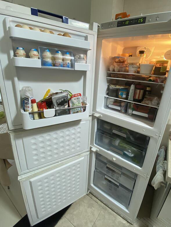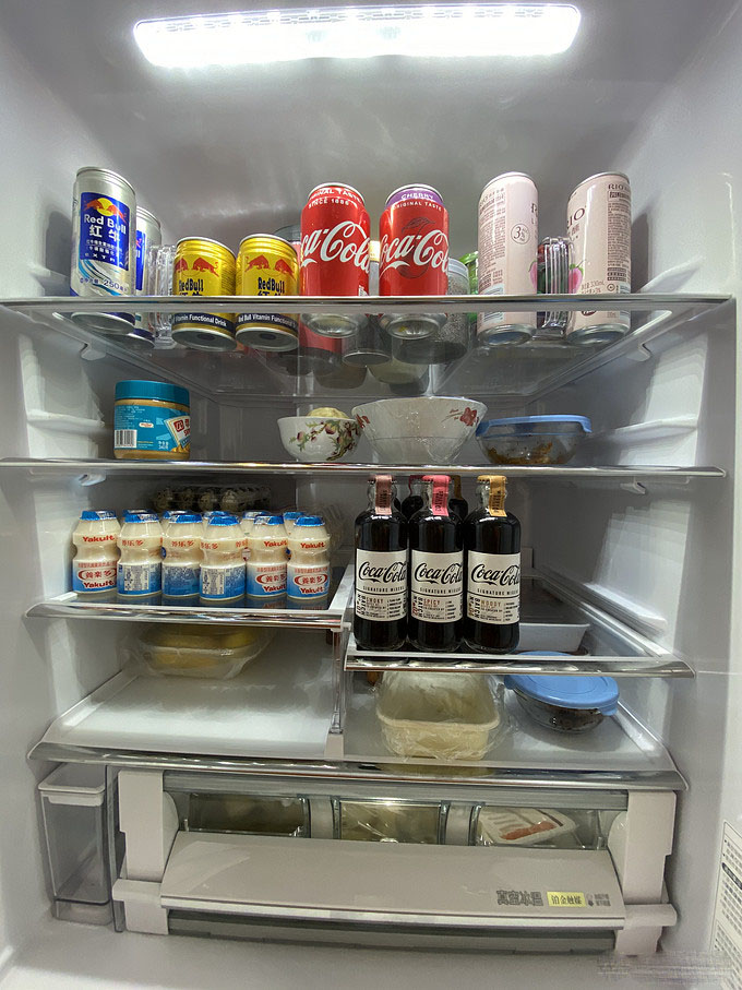 第三大部分为冷藏室,一共三层,最上面一层金属板是急冻层,包了饺子可以放上面急冻,不粘连,日常也是收纳饺子抄手的地方。第二层放比较小的物件,最下面就很大了,边上是可以立着放大瓶可乐这么高的物体。