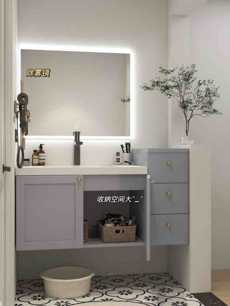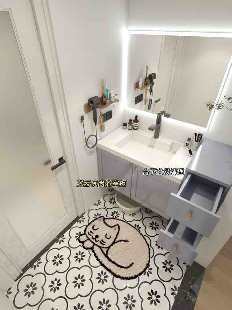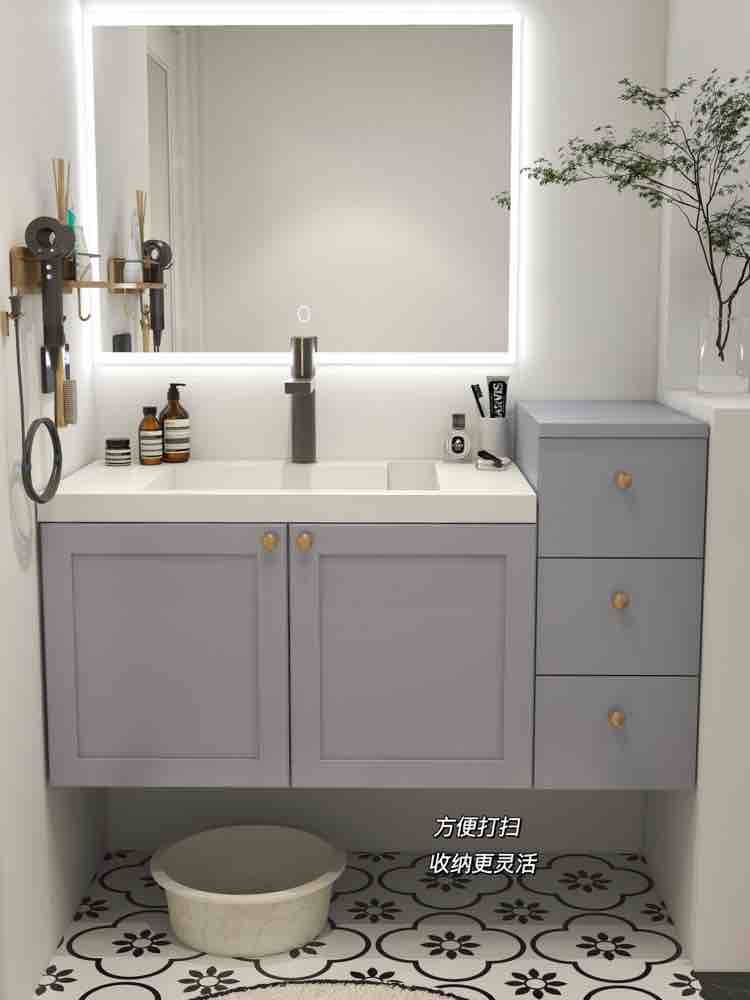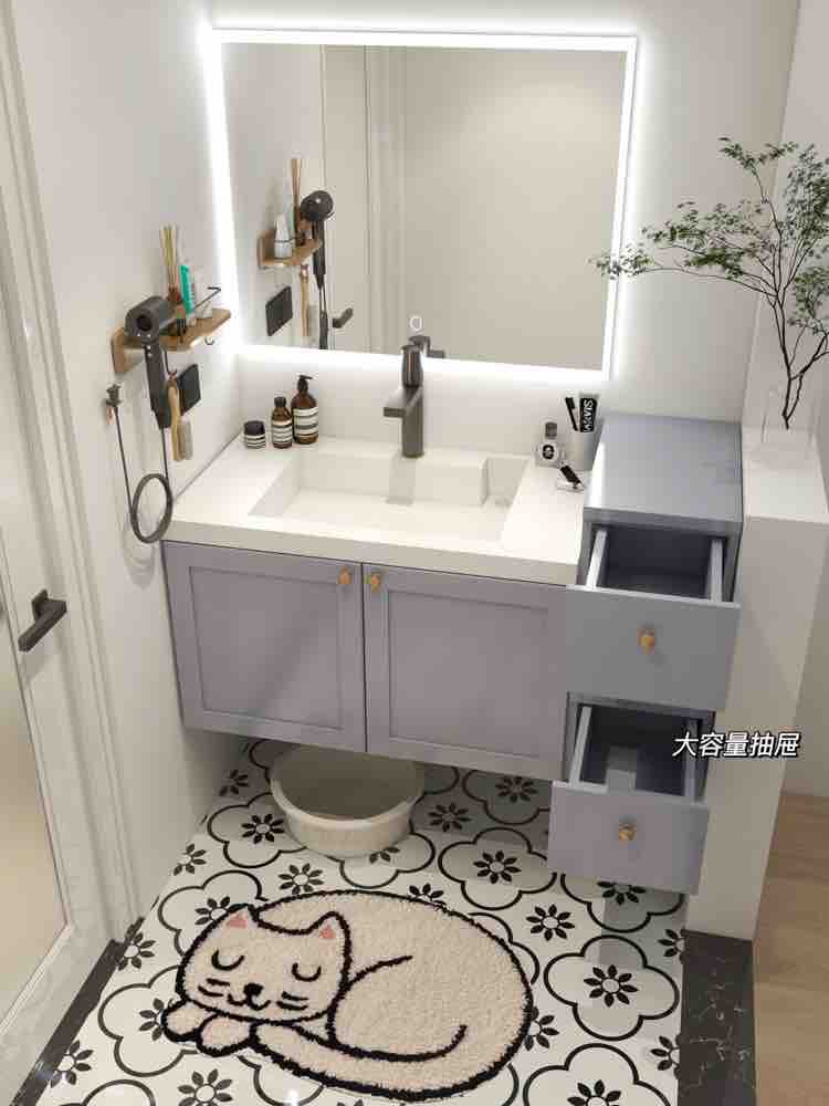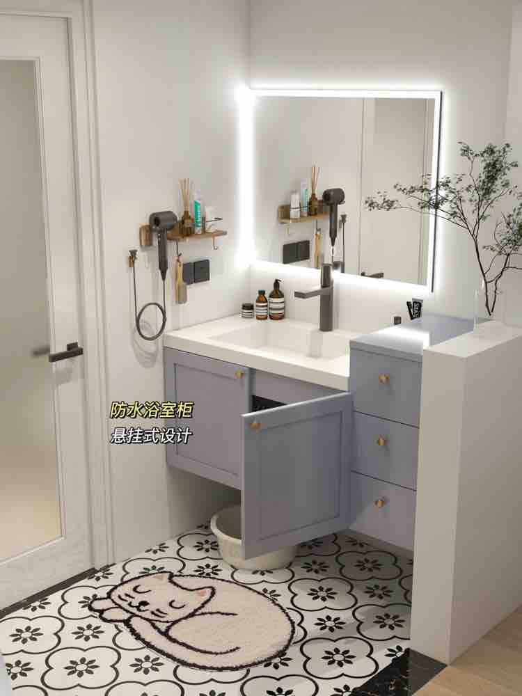 这款奶fufu的梵云优尚浴室柜,雾霾蓝配色和洗漱区的白墙、复古花砖太搭了~在充满氛围感的灯光、喜阴绿植的映衬下,Ins博主家的家居风格就轻松打造出来了!浴室柜悬空的设计不仅看起来更轻盈,底部空出的空间用来收纳常用、大件的物品特别合适~日常打扫卫生也很快手方便,几乎没有卫生死角。不管你家的浴室柜是风格的,台盆都建议安装台下盆。不仅不容易溅水,打理起来也没有卫生死角,台面看起来也更清爽整洁。成品浴室柜的所有配件都是固定的,所以入手前一定要多看看柜体门板之间的五金件品质够不够好,门板拉手质感打不达标等等~这款梵云优尚浴室柜的抽屉、开门活动都很灵活,手感很顺畅,搭配柜体表面的防水层,长久耐用妥妥的!对于女孩子来说,浴室需要收纳的物品一定是比男生多很多的。浴室柜作为zui主要的收纳单品,能装真的是必须的!这款雾霾蓝浴室柜看起来小巧轻盈,实际内部空间很大。双开门内可以用来放一些收纳盒、收纳架,非常自由灵活~右侧抽屉可以放一些需要防潮的物品,深度够深,小物件可以放不少!