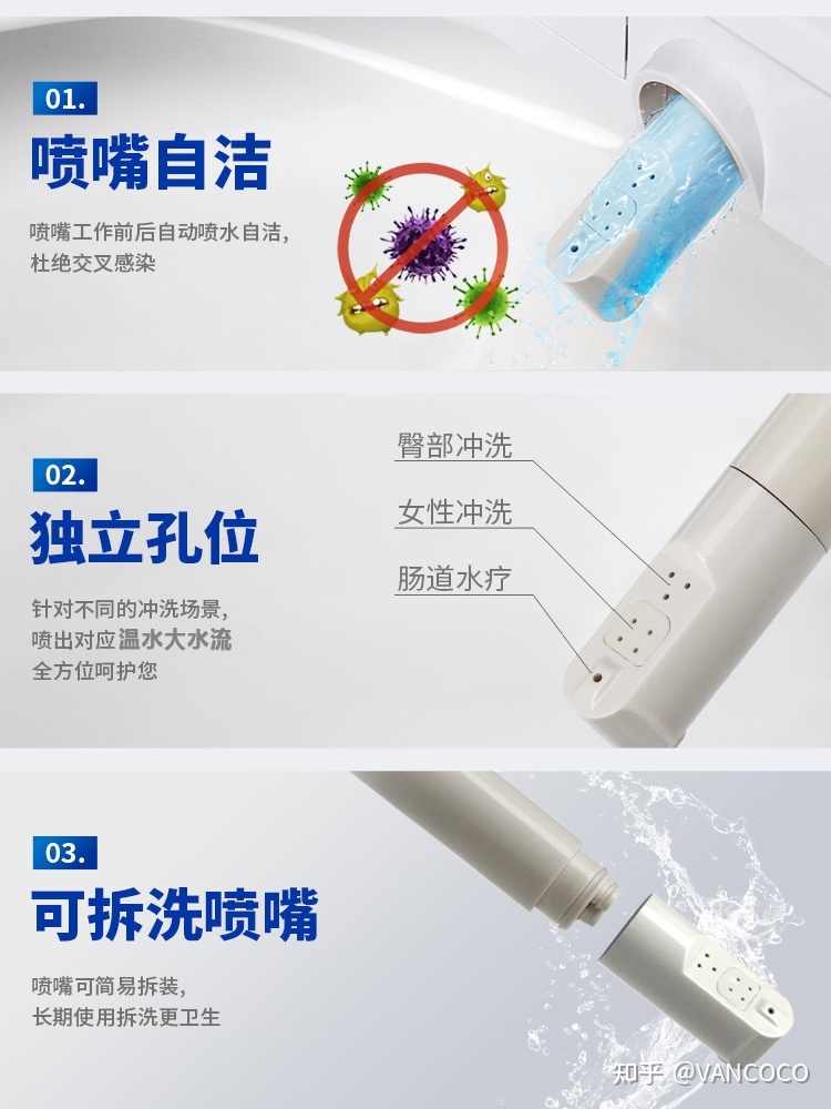 总结:大家选智能马桶不能光顾着颜值、功能,更要注重卫生安全。首先,像储热式这种在国外处于淘汰边缘的产品,就不要选了,技术更安全规范的即热式才是首选。其次,智能马桶的喷嘴需要能拆卸清洗。最后,使用智能马桶冲洗功能不要过于频繁,水流不要太大,不然容易引起炎症。