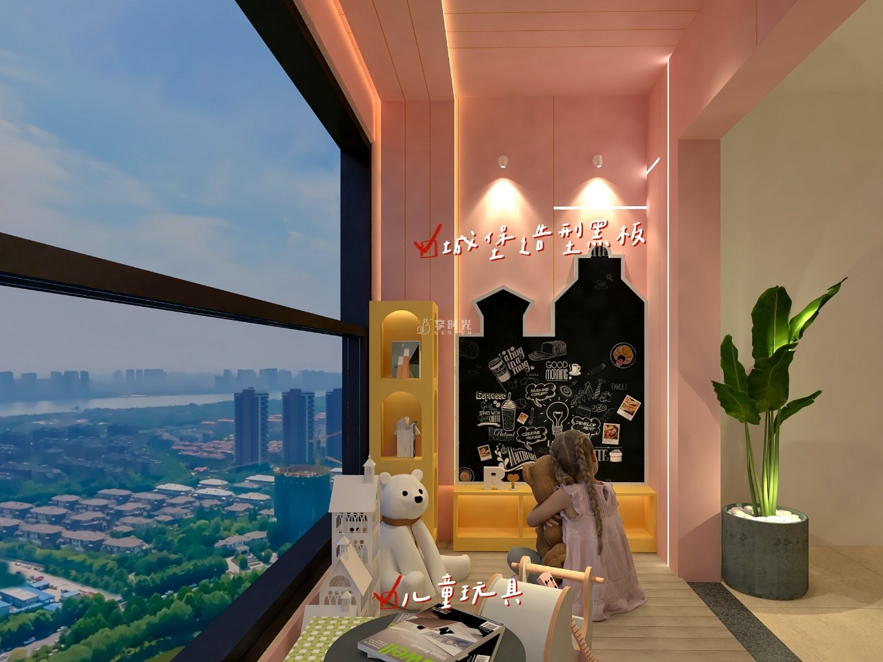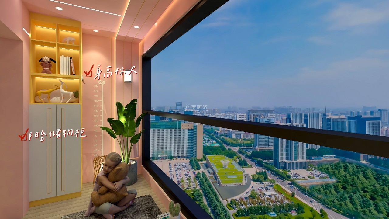 通过阳台设计贴心地为女儿创造了很多成长空间按孩子身高设计置物落地柜从小培养孩子独立收拾的习惯城堡造型的黑板墙满足她学习、画画的需求儿童身高标尺的设计,记录孩子成长每一步......