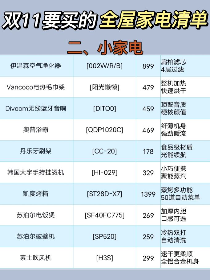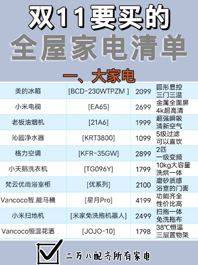 #经验灵感#大家好,今天阿木和大家分享双十一的家电选择攻略,赶快趁着双十一买起来吧~.电视LED性价比高,OLED效果好,选4k4核,运行内存至少2GB的。.冰箱买1级变频的省电,优先选双循环或者三循环系统。.洗衣机容量选大不选小,洗衣服可以一次搞定,很省心。.空调一定选大品牌的,质量和售后都有保障。选1级能效变频的,匹数买大一点的用起来更舒服。.洗碗机 选择嵌入式,身材小的更好,不占厨房空间。有软水功能的,带热风烘干,噪音小的,悄悄洗净烘干碗筷。.智能马桶 选择即热式的,使用活水,即用即热,卫生而且省电。选择虹吸式冲水 ,冲水声音小还防臭。清洗喷头位置可以调整,并且有自洁功能的。.扫地机器人选择续航能力强,清洁力强 的。能自动识别,灵活规避障碍物的。