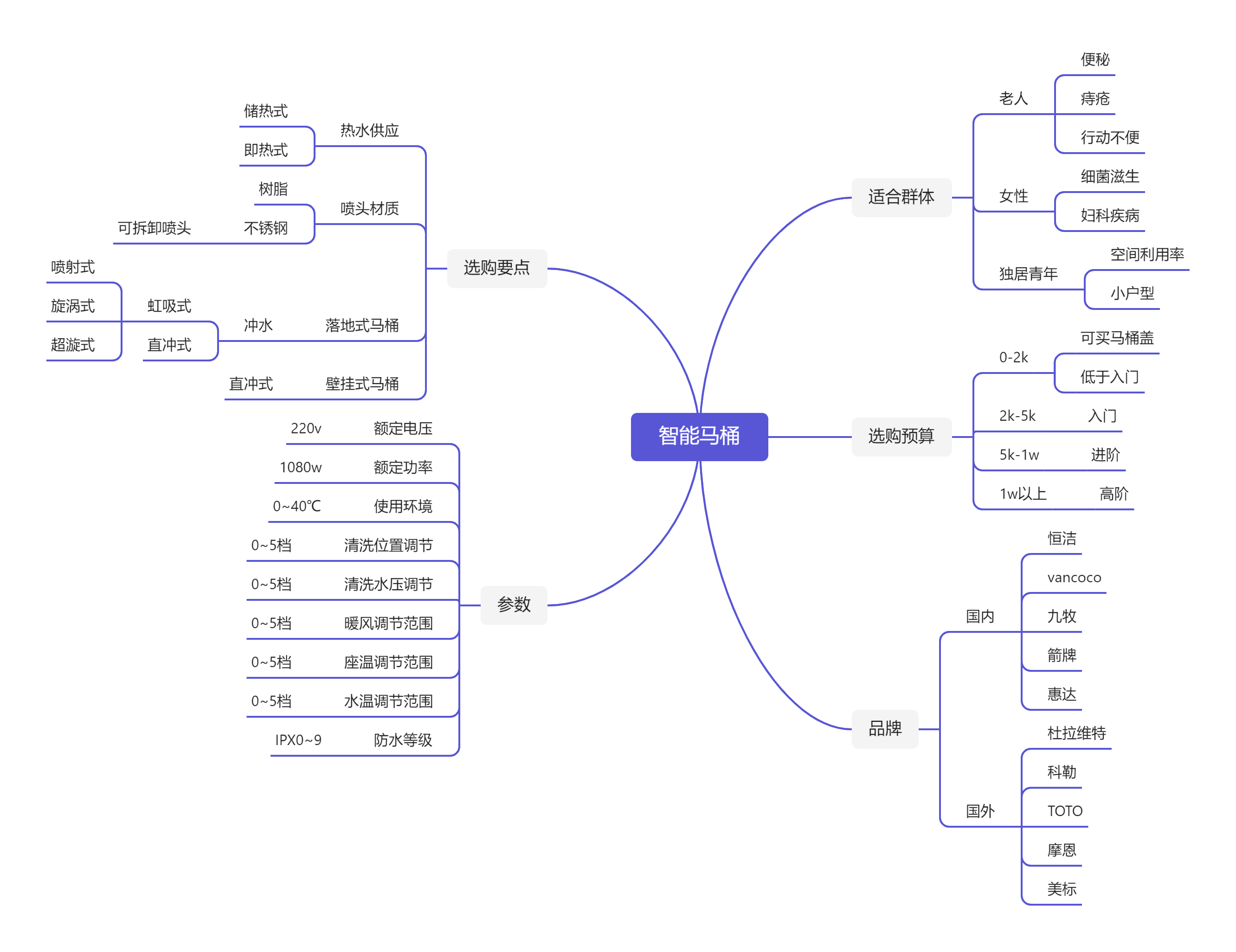 首先要确定预算:壁挂式的智能马桶相对落地式的智能马桶要贵1-2k,在确定预算前先决定是要买壁挂式还是落地式智能马桶0-2K:低于入门级以下的预算,各项指标参数都属于最低档,热水来源是基本是储热式,耐用度较差,建议这个预算可以买智能马桶盖是可以的。2K-5K:是大多数购买智能马桶的预算范围,功能参数相对来说较为齐全。5K-1w:基本就是国外品牌为主,智能马桶功能完善,售后的服务相对比较好,品质感较佳。1w:基本都是国外品牌,设计感和品质感绝佳。