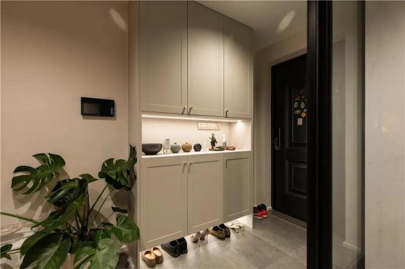 玄关侧边定制一个鞋柜,鞋柜的中间留空摆上装饰品,底部留空方便常穿鞋子的收纳,结合暗藏灯带的呼应,让空间显得更加温馨层次,并在鞋柜旁边摆上一盆龟背绿植,让空间显得清新舒适。