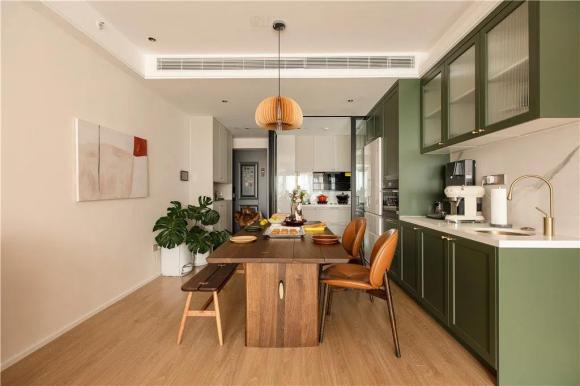 餐厅布置一张长餐桌 板凳 复古餐椅的组合设计,侧边定制一个墨绿色的餐边柜,并把电器与冰箱嵌入到餐边柜里,保持着空间的简洁与清新高级感。深木色的定制餐桌,餐桌上布置精致的餐具与食品,上方一盏独特复古范的吊灯装饰,让空间显得优雅情趣。