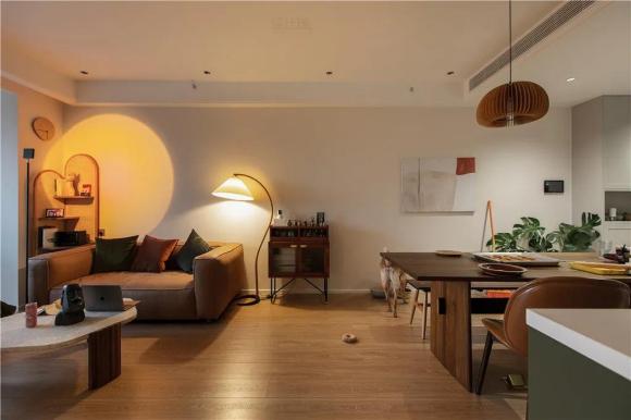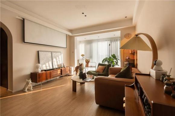 客厅的硬装方面以简洁为主,搭配棕咖色的软装布置,使得整个空间都充满暖心复古的感觉。电视墙布置一个实木电视柜,摆上装饰画的点缀,取消电视剧以投影仪的设计,暖色调的设计下,带来一种简洁优雅的高级设计感。