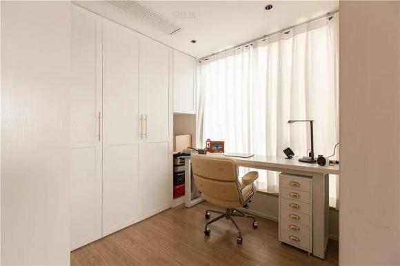 书房定制一个收纳柜,靠窗布置梳妆,窗户装上纱帘挡住强光,为主人提供了个明亮舒适的工作阅读氛围。