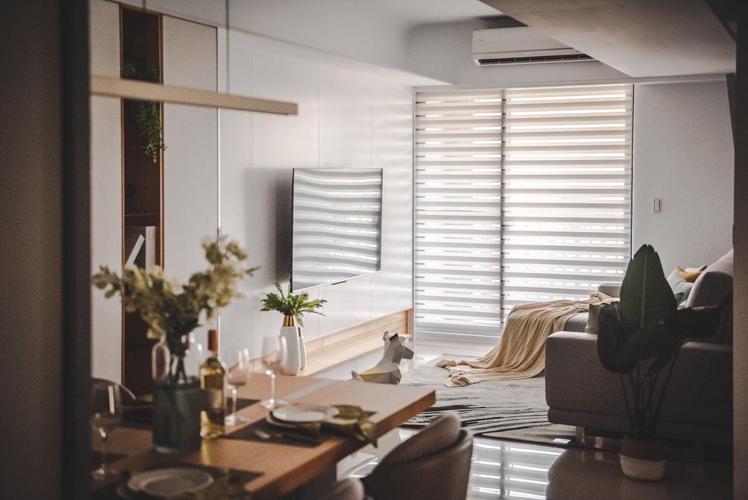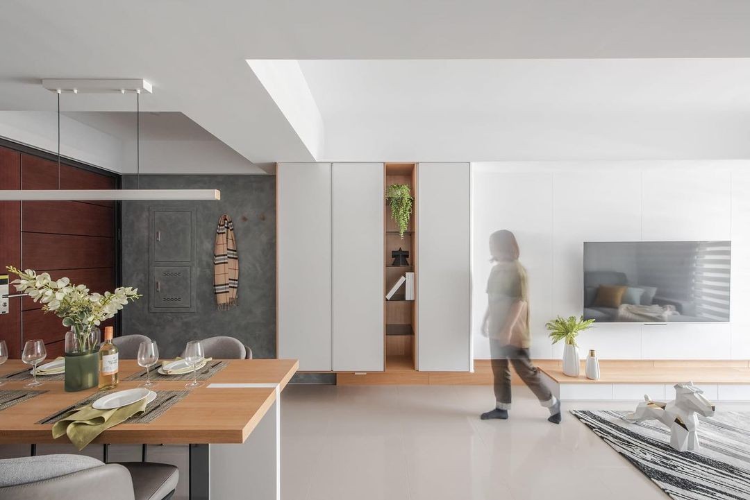 客厅与餐厅的地面采用温暖的米色瓷砖通铺,干净明亮又不会产生清冷氛围。
