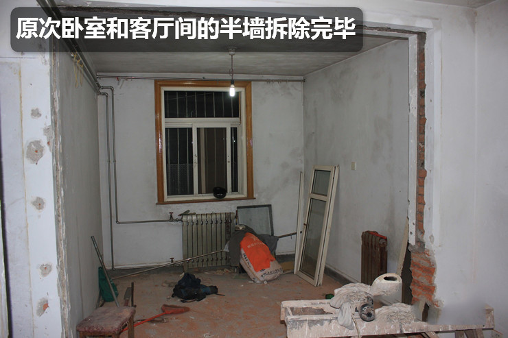 两堵半墙和厨卫的墙砖及卧室的地板拆除工作已经完成。