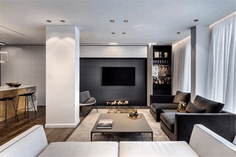 客厅里也有一堵碍眼的承重墙,也没关系,刚好用来区分客厅与吧台区,背景墙用同一种肌理来作延伸,整个空间动线就合理了。光源全部采用射灯、灯带和灯管,只为呈现更加彻底的简洁效果。黑白灰的主视觉,加上一点点的暖光源,整个氛围美好得不行。