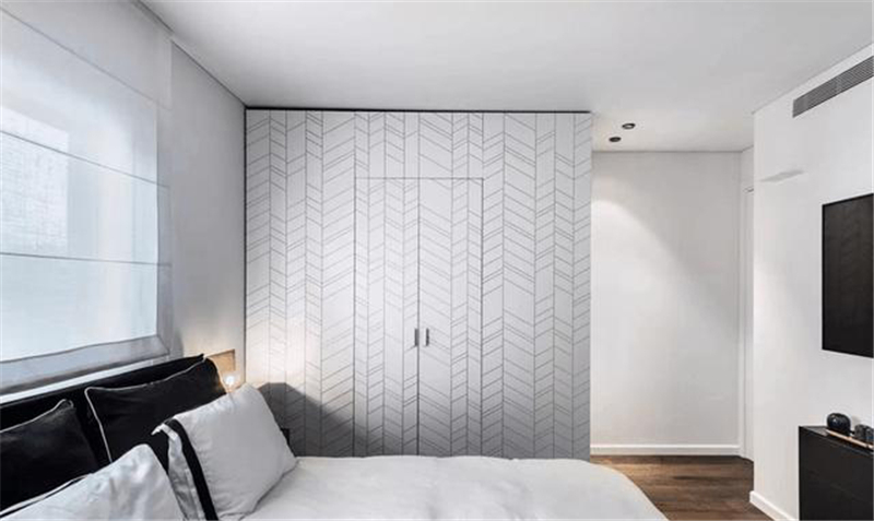 卧室没有做门,仅用一个到顶衣柜做区隔,材质与客厅背景墙一样,虽然在这个空间里存在感很低,但储物量惊人。卧室更重要的是休息,所以减少了黑色的使用面积,用通透的白和浅调的灰来营造轻松氛围。