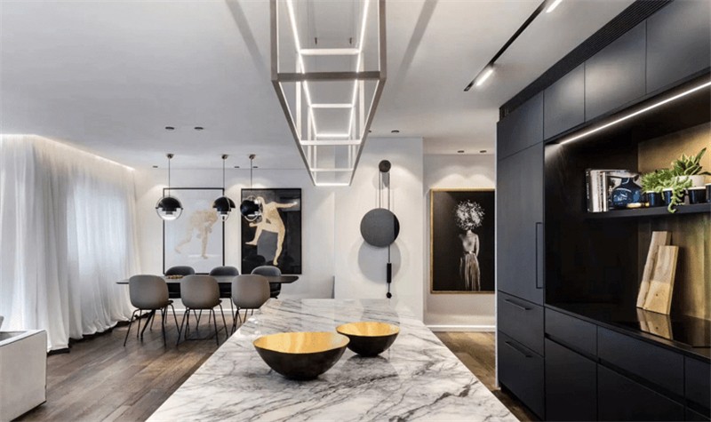 舍弃了一个书房的空间,做了一个吧台区,平时喜欢自己煮煮咖啡,喝喝小酒。有这么个高颜值的吧台在家,都舍不得出门了,有工作需要处理时,在这也很有氛围。一整面墙的储物柜,用来放那些心头好,中空设计用来展示收藏品,大理石台面带来满满的高级感。