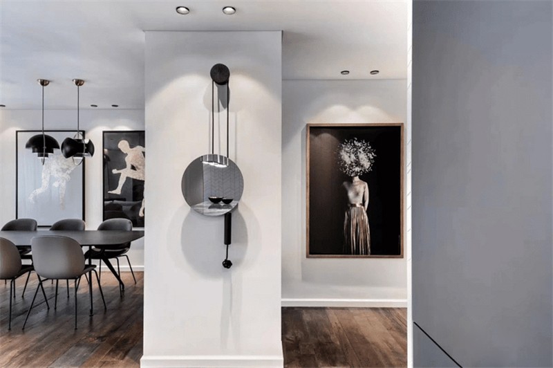 因为户型的缺陷,公寓没有真正意义上的玄关,鞋子们都藏进深灰色的墙柜里,柜门一关啥都看不见,一切都超级简洁干净。迎面就是一堵承重墙,但是没关系,挂一个造型夸张的装饰,缺点也变成优点了。