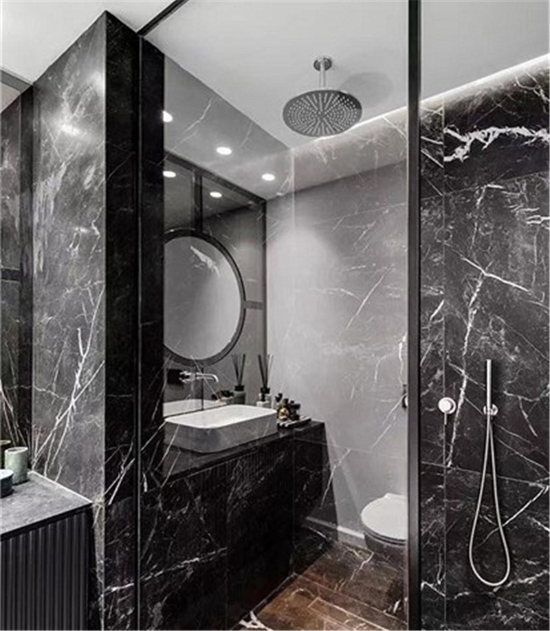 卫生间是整体家装中花费最高的区域,好在面积比较小,还能承受。地面墙面全部用了大理石瓷砖,不规则的斑驳纹理超有范儿,用镜面延伸空间感,让实际视觉效果显得非常大。