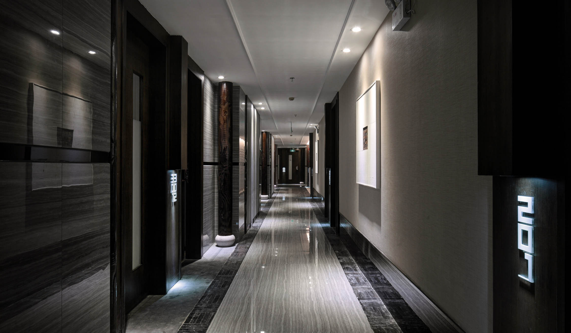 走道利用灰色调的石纹砖为基底,点缀砖石花线和木质立柱,打造出如同《聊斋》里的水墨风格走廊,给人强烈的视觉冲击。