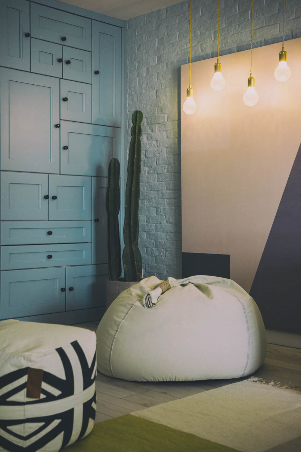 随机感强烈的抽屉和懒人布袋沙发在客厅一侧形成了供人撒放自我的休闲区;空间整体铺上了清新的,让人联想起自然意象的色彩。