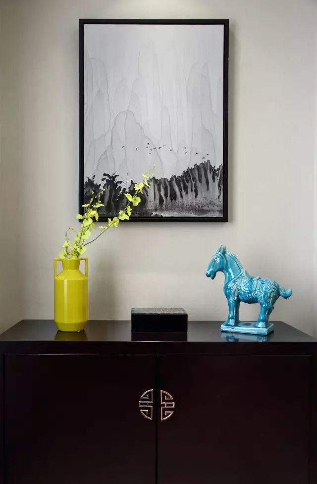 进门鞋柜黄色的花瓶和天蓝色的马有没有把你惊艳到?而我第一眼看到的,不是抽象派山水画装饰,也不是花瓶和马,而且玄关柜上中式的花纹装饰。虽然如此简单,但呈现出来的却是一个具有中式韵味的玄关,吸引眼球。