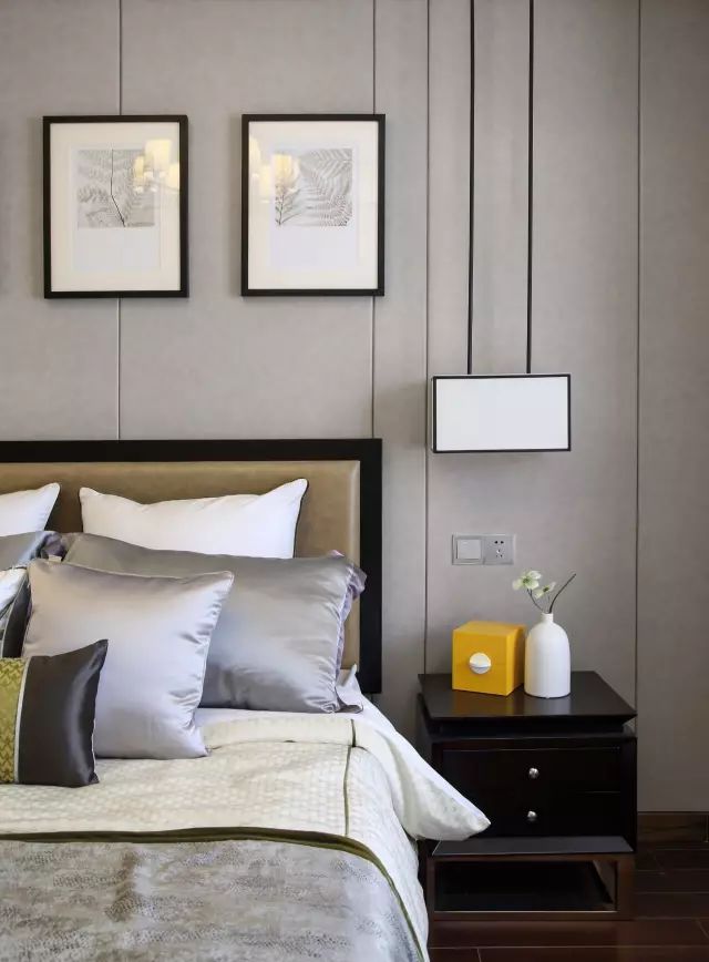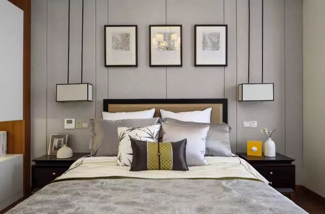 主卧背景墙延续了客餐厅背景墙的设计,让整个装修风格更加和谐统一。次卧背景墙做成硬包,再用一组装饰画装饰,呈现出很有品质的生活。吊灯的4条黑线与硬包的缝隙,无形中组成了一个很特别的画面。
