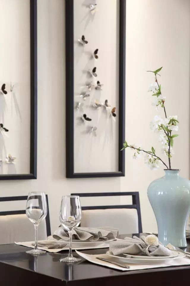 纯色系列的沙发,搭配多种颜色的抱枕,低调中的奢华感油然而生,而色彩中的变化,在视觉上给人很有层次。餐厅延续了客厅的设计,背景墙两边采用木饰板 壁灯的形式,中间则是深色边框把蝴蝶饰品框起组成与众不同的装饰画。蝴蝶可随机排列,呈现出一面很有生机的墙面。