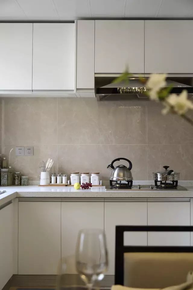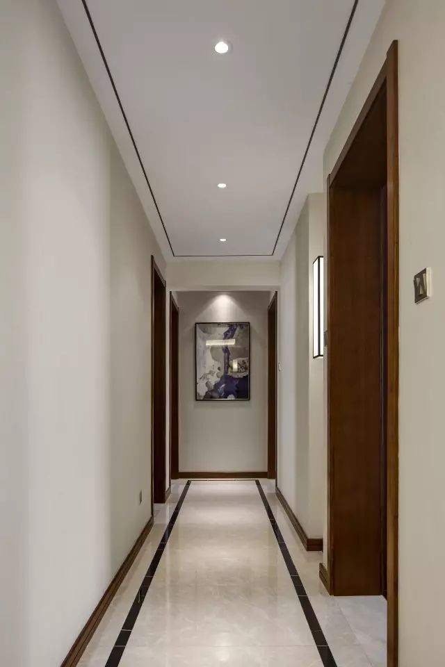 精致的餐具,体现了精致的生活态度。浅色的墙面与木色的门框相撞,同时踢脚线采用与门框相同的颜色,然后顶面及地面分别用了黑色线条点缀,让原本看起来单调又狭长的过道变得很有设计感,很耐看。