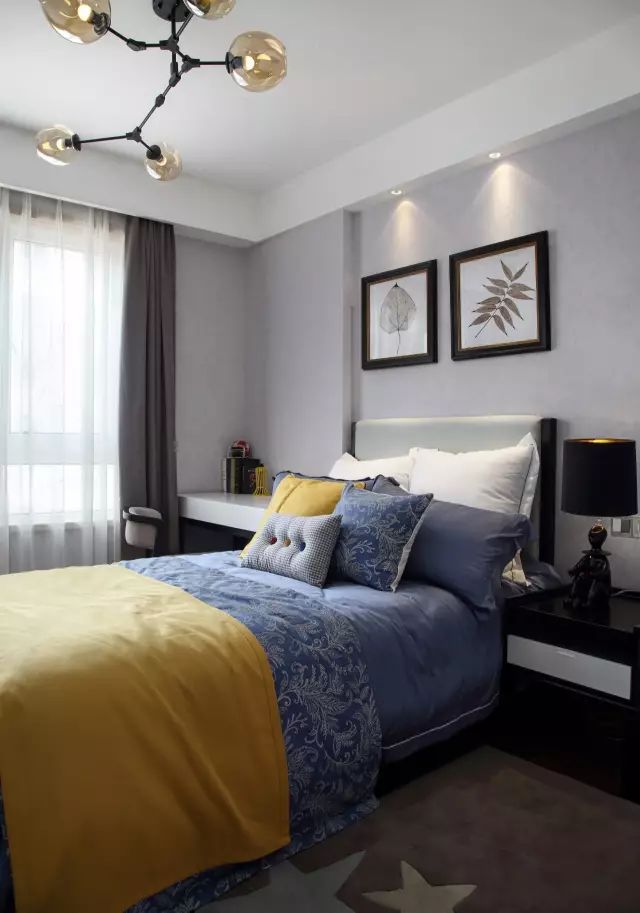 儿童房的设计则偏向实用性,没有太复杂的硬装造型,更多的是在软装上下功夫,蓝色系列的床品,一边摆放书桌,另一边摆放床头柜,让整个卧室的实用性做到最佳。白色的橱柜,明亮又干净,很有年轻人的时尚感。