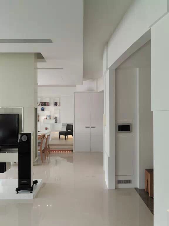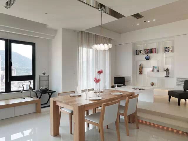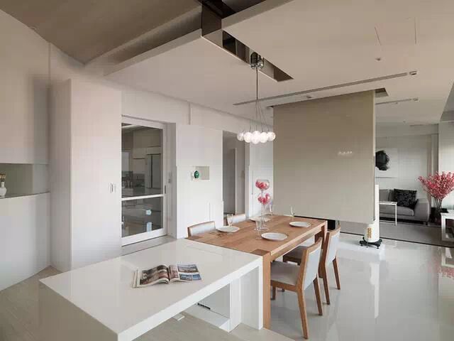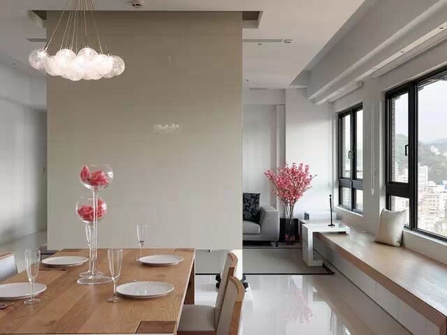 导语:本案在设计上业主喜爱乾淨的白色色系,整个设计以接近北欧风的素雅、自然元素为主。将原先的三房格局,变更为二房,多出来的空间除了将二间卧室加大外,更让衣帽间的收纳空间能更充足。空间的规划上,采用开放式的客、餐厅规划,客、餐厅之间仅以悬吊式电视加以区隔。另一个特色则是将餐厅与书房以开放式、一气呵成的方式规划,长形桌子从餐厅延伸至书房,二者相连结,可将二个空间结合为一完整通透的大空间。餐桌结合了完整的上网机能,因此可在餐桌上上网结合书房的功能,而书房在使用上则可更为轻松,坐在休閒闲椅上舒适地读一本好书。
