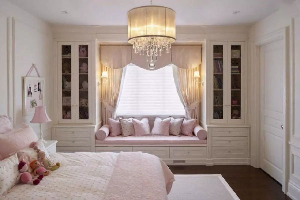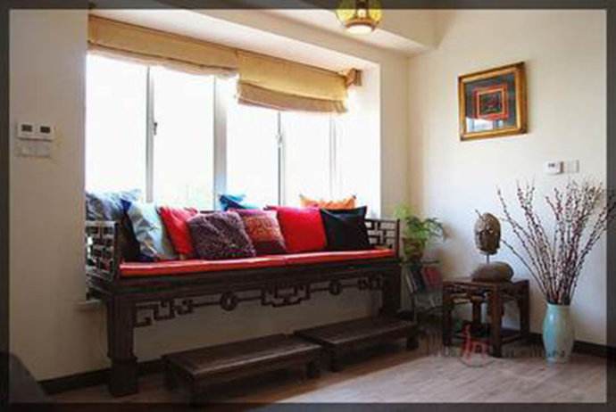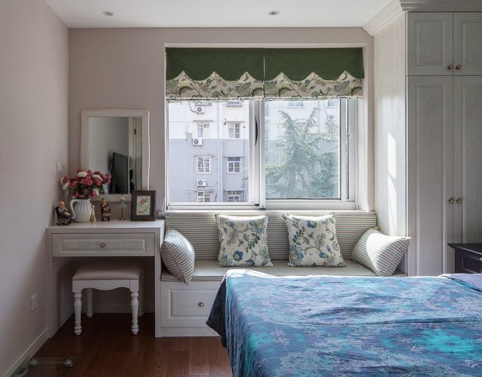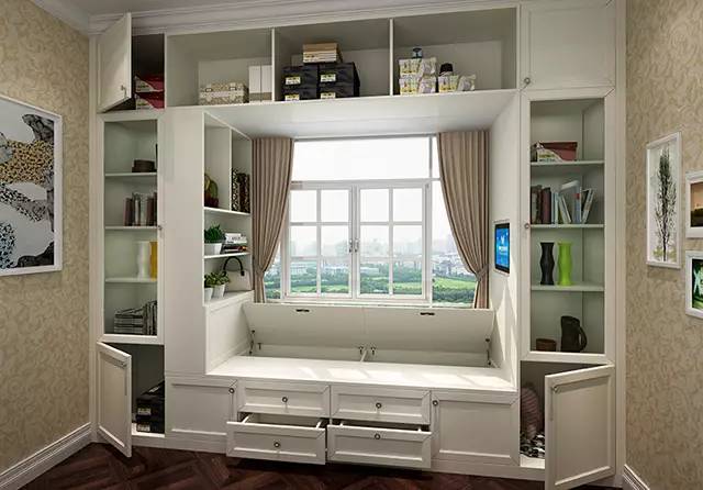 3. **书架或展示架**:如果空间足够,可以考虑在飘窗下方安装一个小书架或展示架,将一些书籍或装饰品摆放上去,既能省空间又能美化环境。