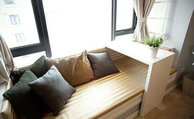 家里的飘窗太高,那可以做成榻榻米啊,1米高的榻榻米,人正好可以坐在上面,再在上面铺一些垫子,可以放一张桌子,周末的时候可以坐在榻榻米上看书,写字,喝茶,很惬意的呢!