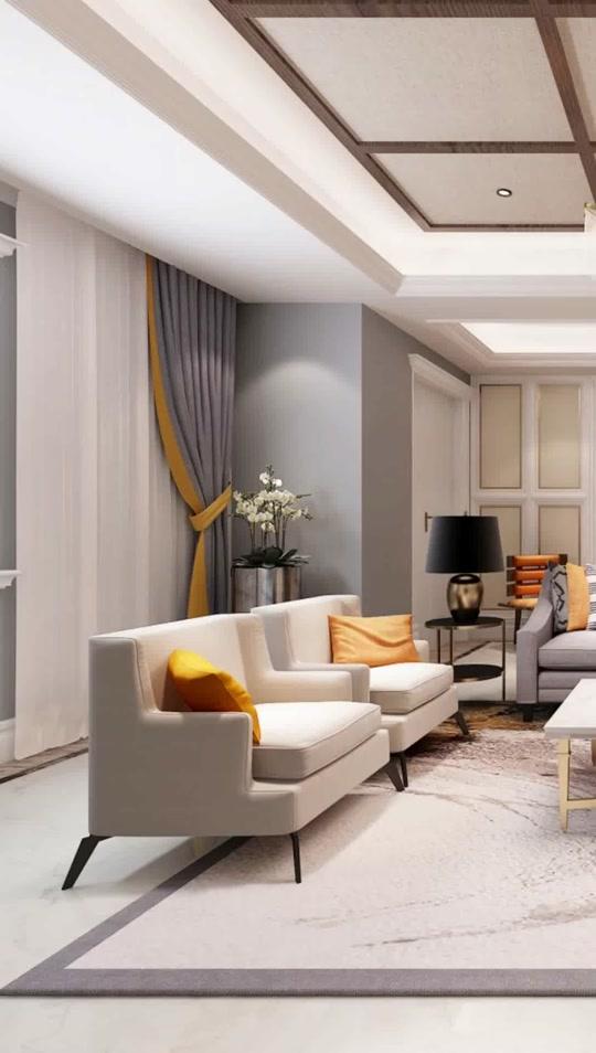客厅墙面以白色为主,可以使空间看起来更加明亮,客厅中的沙发选用了黄色,不仅温馨而且时尚。地板选用了白色的大理石瓷砖,再用绿植进行点缀,使得整个空间温暖、明亮,又不失艺术感。