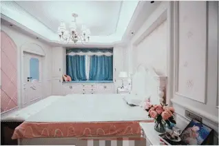 卧室背景墙用了壁纸进行装饰,使卧室看起来空间感更有层次感,而白色的天花板上安装了艺术吊灯,带着地中海式的华丽,床品的细腻装饰给人一种神秘感,整个空间实现了完美的呼应。