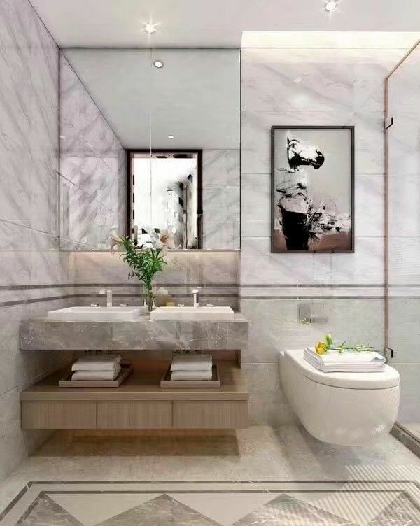 卫生间中的洗脸池上,做了一个超大的镜子,显得整个卫生间更加宽敞,洗脸池上还摆放着绿植,给卫生间起到了点缀效果,而墙面采用复古砖与马赛克结合,给人一种复古又时尚的感觉。