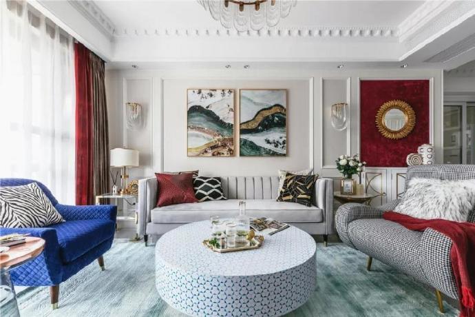 除了皮艺的质感,布艺质感的沙发,通过独特的颜色搭配,也可以搭配出轻奢华丽的空间感。