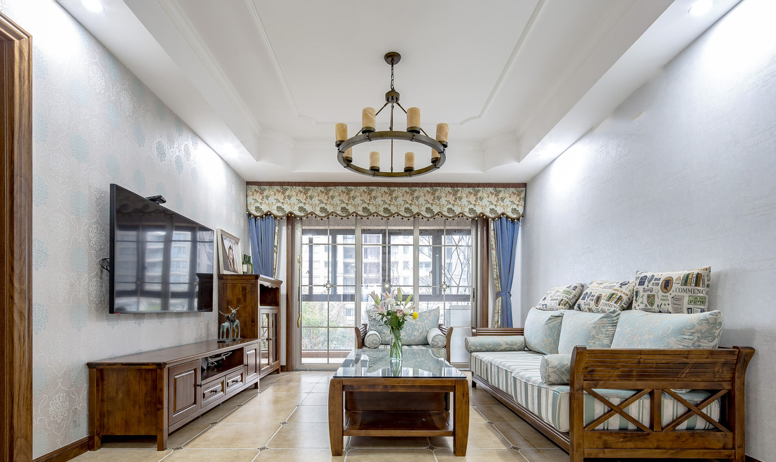 蓝色布艺沙发,一种安静优雅的搭配,用在客厅里面,布置的效果也是非常的优雅精致。