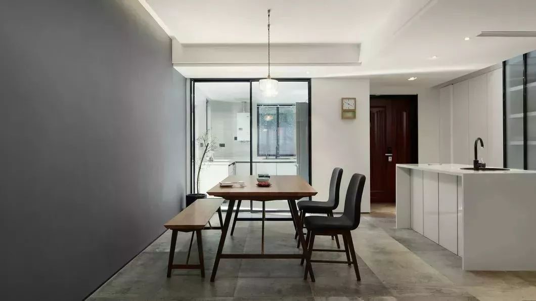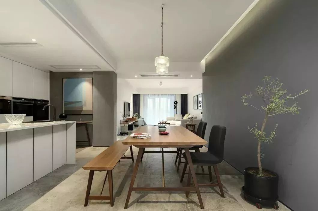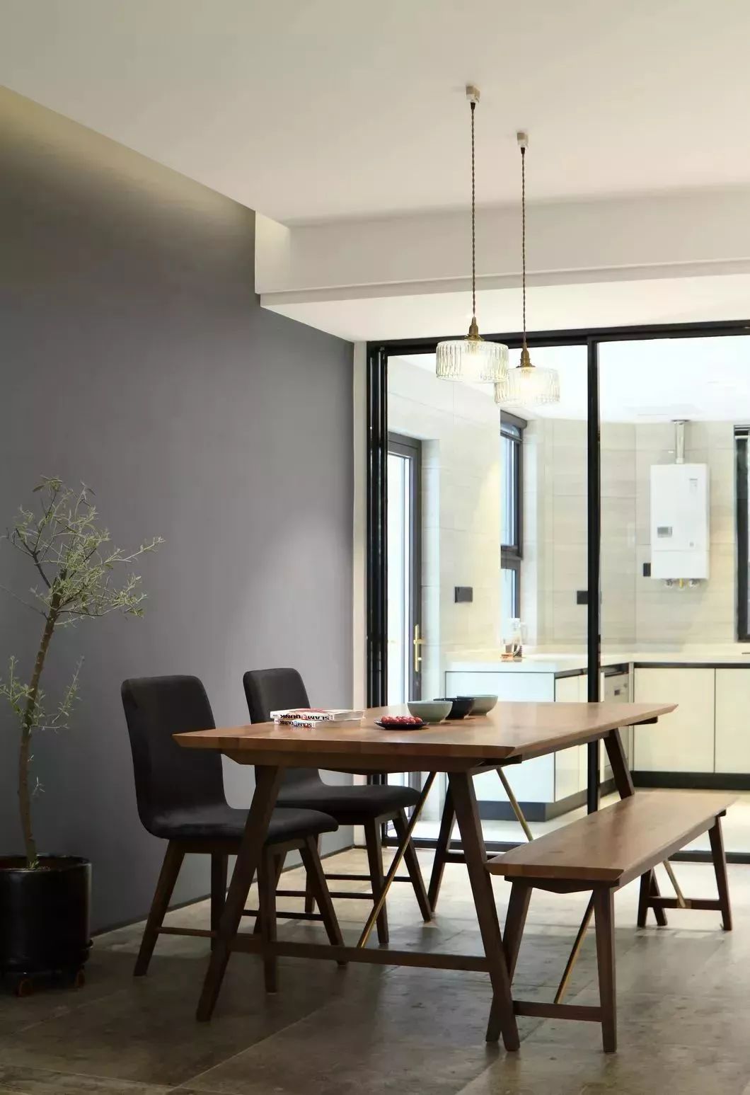 餐厅角落里绿植让简约的空间多了一些轻松与随意,暖色灯光营造了富有层次的光线变化。