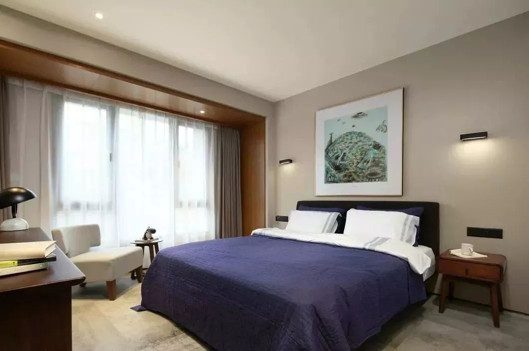 米色的床头背景墙上挂上衣服白边的装饰画,充满随性的挂画、尽显年轻时尚的艺术气息。清晨,阳光透过大大的落地窗照进来,美好的心情能持续一整天。