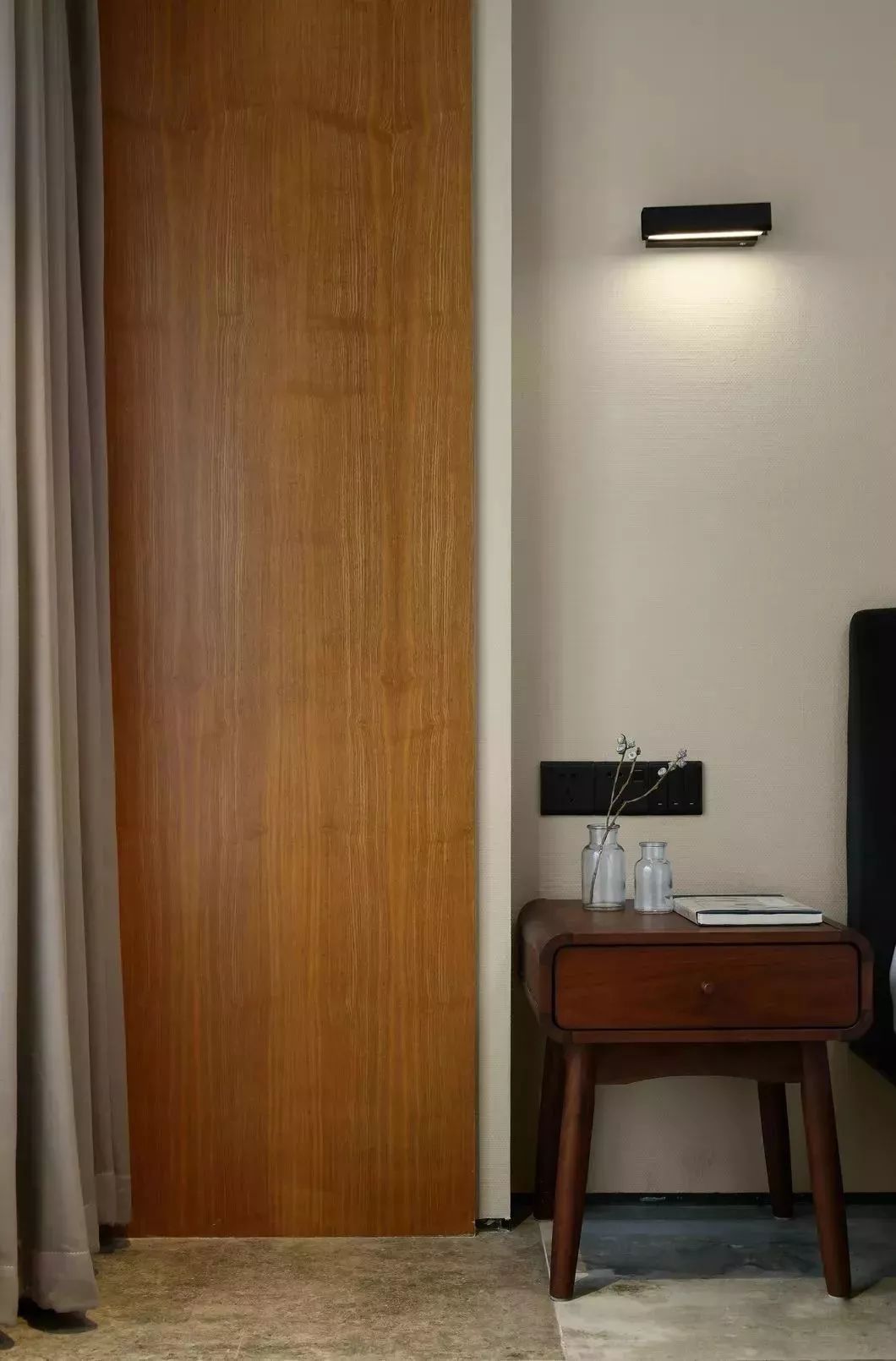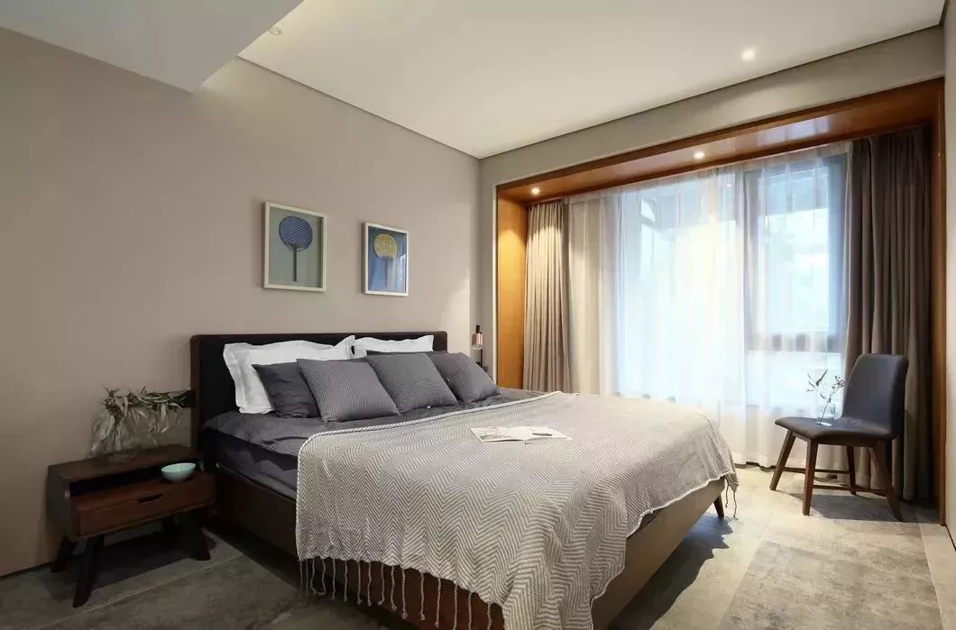 次卧设计以温柔的灰色为主调,做旧的床头柜与棉麻舒适床品的柔软相搭,让空间的质感构成平衡。