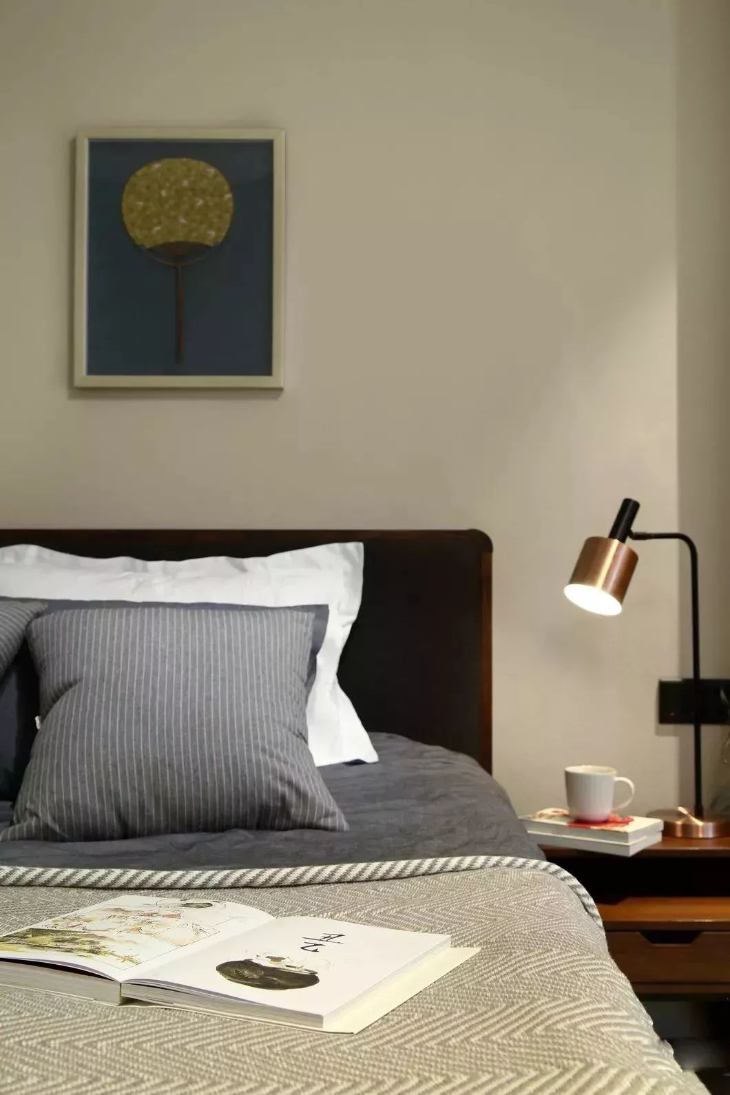金属台灯的置入,让空间更显得清透明净,内敛中透着时尚。床上的画册为睡前时光增加了休闲感。
