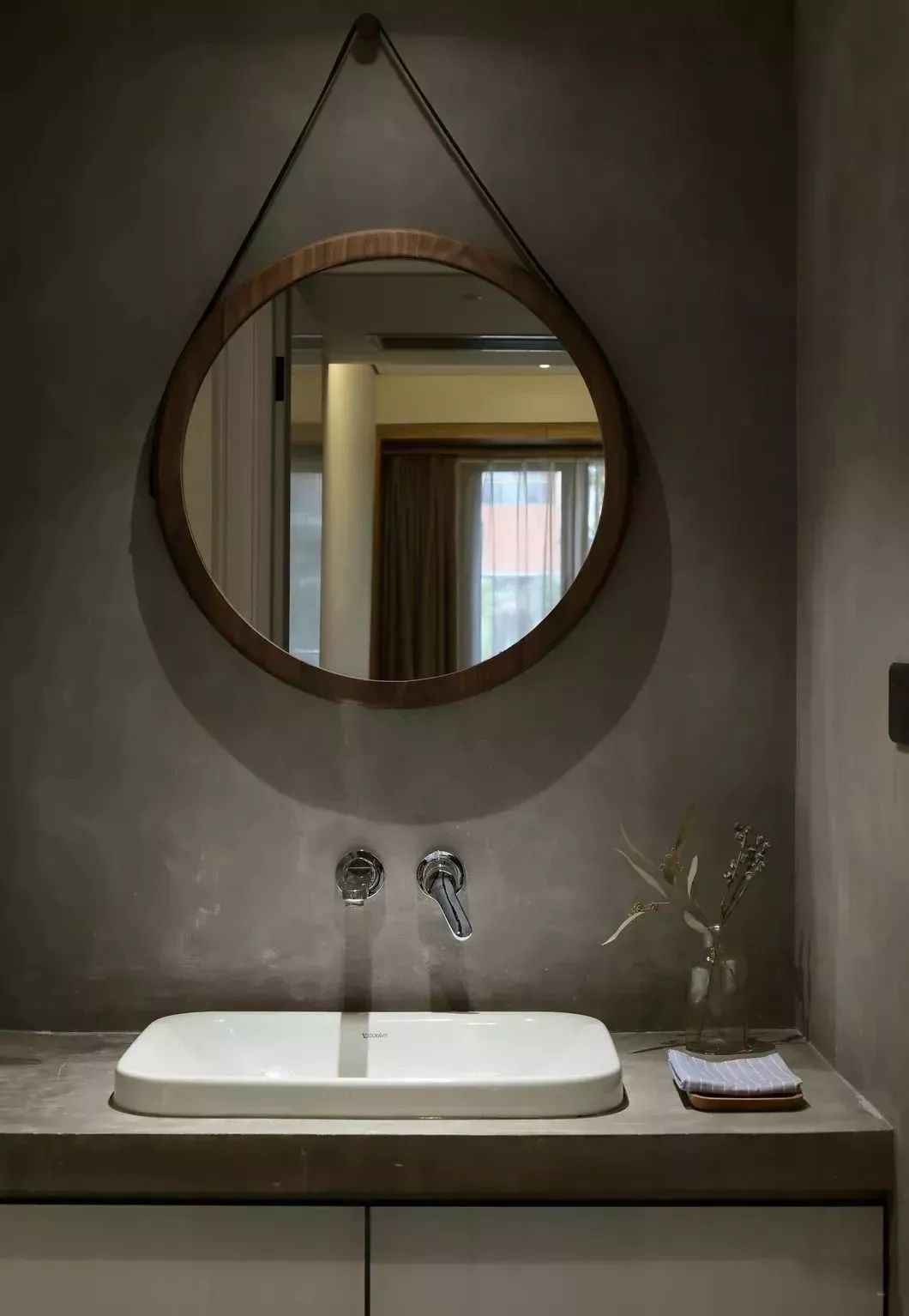 卫生间灰白搭配简洁美观。墙上的皮带原木挂镜,增添了精致感。