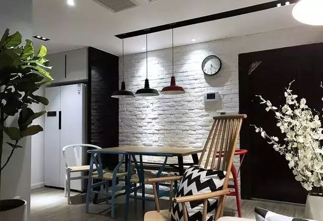 餐厅以白色的文化石背景墙进行装饰,临近冰箱的里面以黑色玻璃进行装饰,增加通透性。