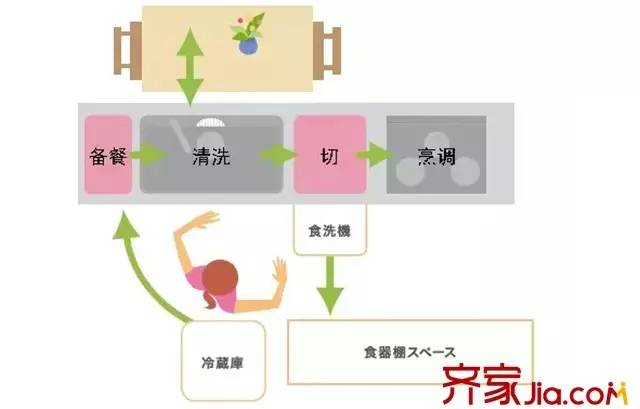 一字型厨房厨房工作区靠一面墙布置,空间需求小,工作区组合简单,适合瘦长型厨房。储物区→备餐区→烹制区一字排开,一条动线贯穿做饭整个流程。