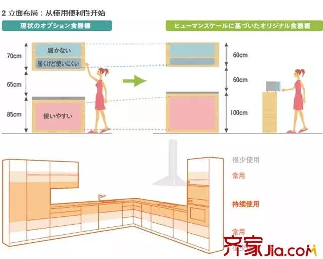 下方柜子使用起来较为方便,上部的吊柜虽然能够着但是相对使用率较低。因此,在条件允许的情况下,适当增加下部操作台的高度,增加下方的收纳面积,同时适当减少吊柜的尺寸,也许更为合理。
