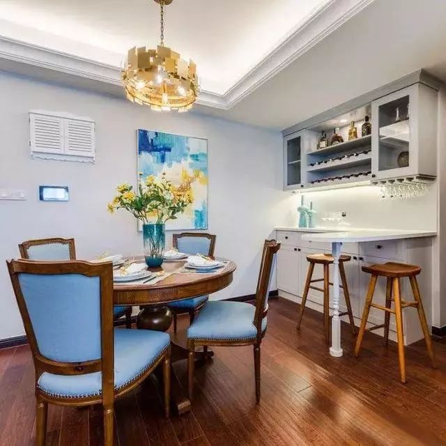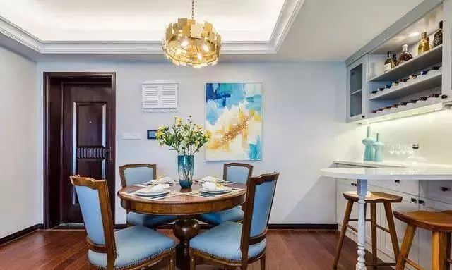 一幅油画、四把蓝色餐桌、一束鲜花就让整个餐厅的气氛完全不同,美又优雅~